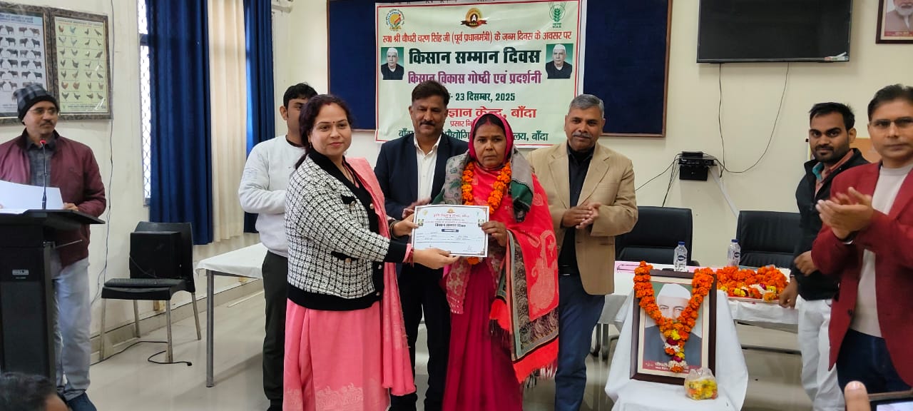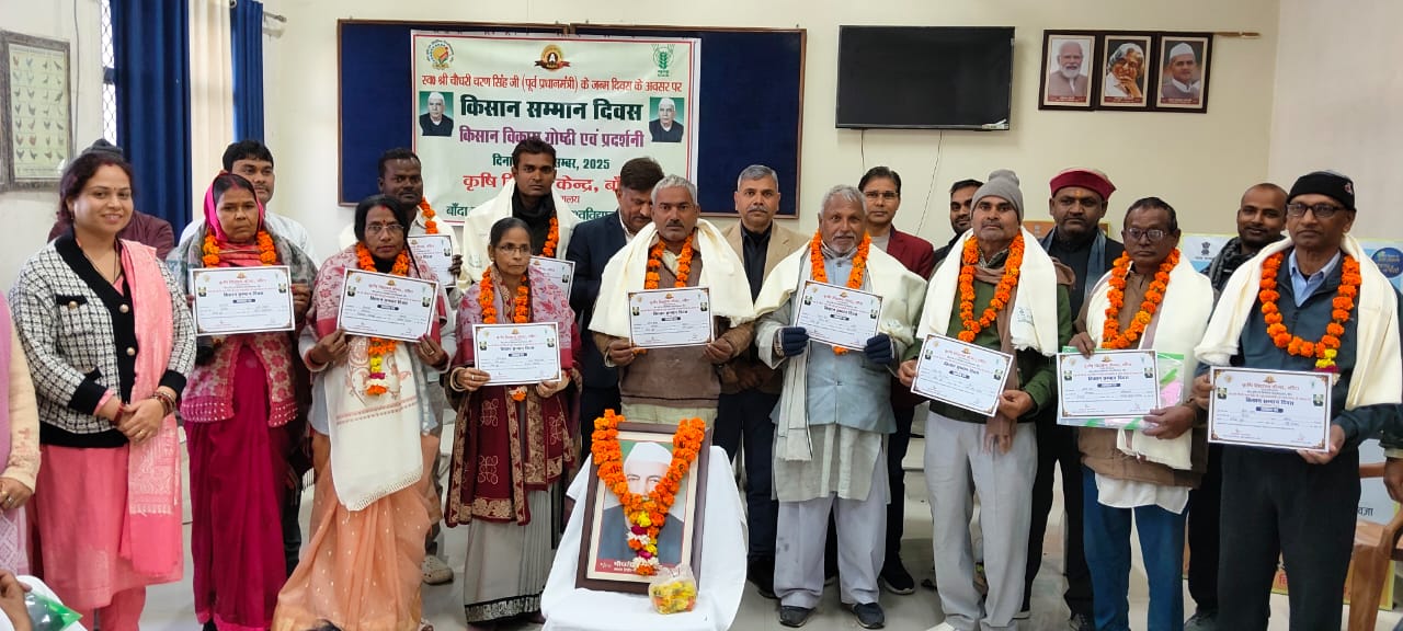 किसानों के मसीहा भारत के पूर्व प्रधानमंत्री स्व0 श्री चौधरी चरण सिंह जी के जन्मदिवस को किसान सम्मान दिवस के रूप में कृषि विज्ञान केन्द्र, बांदा में दिनांक 23.12.2025 को मनाया गया। इस अवसर पर कृषक गोष्ठी एवं प्रदर्शनी का आयोजन केन्द्र परिसर में किया गया। कार्यक्रम में मुख्य अतिथि के रूप में कृषि महाविद्यालय के अधिष्ठाता डा0 जी0एस0 पंवार उपस्थित रहे। कार्यक्रम में केन्द्र के अध्यक्ष डा0 श्याम सिंह , केन्द्र के विशेषज्ञ डा0 प्रज्ञा ओझा, डा0 चंचल सिंह, डा0 दीक्षा पटेल एवं विश्वविद्यालय के सहायक प्राध्यापक डा0 अरूण कुमार समेत 160 महिला कृषकों/कृषकों ने प्रतिभाग किया। इस अवसर पर सभी अतिथियों एवं कृषकों द्वारा चौधरी साहब के छाया चित्र पर माल्यार्पण कर उन्हें नमन करते हुये याद किया गया एवं वक्ताओं ने चौधरी साहब के आदर्षों की पालना करने का आवाहान किया। केन्द्र के वरिष्ठ वैज्ञानिक डा0 श्याम सिंह ने चौधरी चरन सिंह जी की जीवनी पर प्रकाश डालते हुये उनके कृषक हित में किये गये कार्यों का उल्लेख किया, उन्होनें कृषकों से आवाहान किया कि वे विश्वविद्यालय एवं कृषि विज्ञान केन्द्र से जुडकर खेती में वैज्ञानिक तरीकों को अपनायें, साथ ही उन्होनें कृषकों को भारत सरकार के नये अधिनियम विकसित भारत- रोजगार और अजीविका के लिये गारन्टी मिशन (वी0बी-जीराम जी) की मुख्य विशेषताओं की जानकारी देेकर इसके लिये प्रति जागरूक किया। कार्यक्रम में तकनीकी सत्र का भी आयोजन किया गया जिसमें प्राकृतिक एवं जैविक खेती का महत्व विषय पर डा0 श्याम सिंह, वैज्ञानिक नवाचारों द्वारा तिल उन्नयन विषय पर डा0 अरूण कुमार, ने सब्जियों में एकीकृत कीट एवं रोग प्रबन्धन विषय पर, सस्य वैज्ञानिक डा0 अनिकेत काल्हापुरे ने समन्वित कृषि प्रणाली (प्थ्ै) में तिल की खेती की सम्भावनाओं पर प्रकाश डाला और उन्नतशील तिल की प्रजातियों को मेड़ों पर बुआई कर अतिवर्षा के नुकसान से बचाया जा सकता है। डा0 चंचल सिंह, बुन्देलखण्ड क्षेत्र में प्राकृतिक संसाधन प्रबन्धन विषय पर, डा0 दीक्षा पटेल एवं सब्जी उत्पादन की उन्नतशील तकनीकी विषय पर, डा0 प्रज्ञा ओझा ने कृषकों को प्रशिक्षित किया। कार्यक्रम में केन्द्र से जुडे हुये जनपद के 12 कृषकों/महिला कृषकों को उनके द्वारा कृषि के क्षेत्र में उत्कृष्ठ कार्य हेतु कृषि महाविद्यालय के अधिष्ठाता डा0 जी0एस0 पंवार ने प्रषस्ति पत्र एवं अंगवस्त्र भेंट कर सम्मानित किया गया। सम्मानित होने वाले कृषकों में श्री अशोक सिंह, ग्राम गुरेह, श्री शिवाकान्त मिश्रा ग्राम अरबई, श्री धर्मेन्द्र कुमार, ग्राम चहितारा, श्री हुकुमचन्द्र निषाद ग्राम कनवारा, श्रीमती सूरजकली ग्राम दरदा, श्रीमती शैल कुमारी ग्राम जमालपुर, श्रीमती अर्चना शुक्ला, आवास विक
