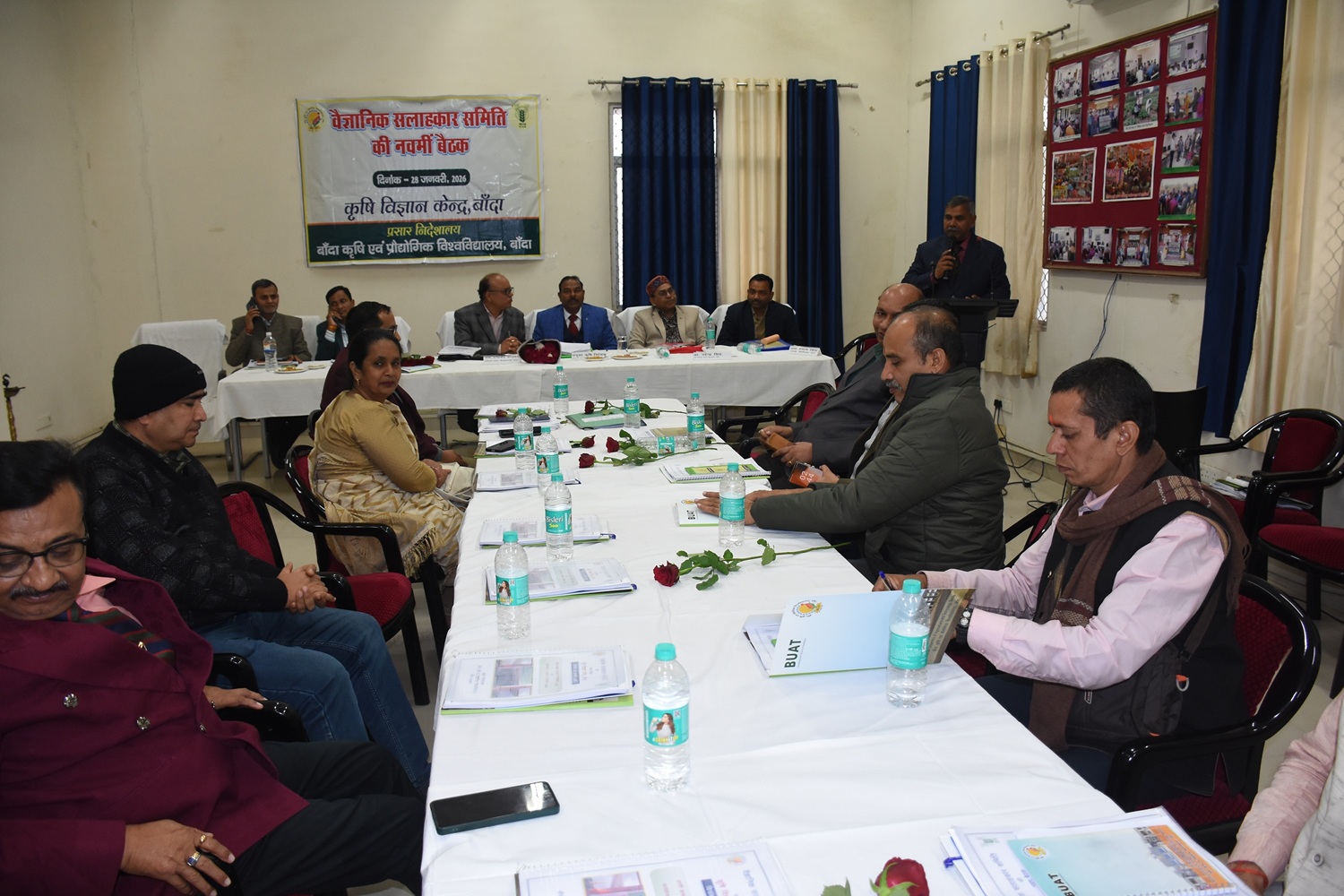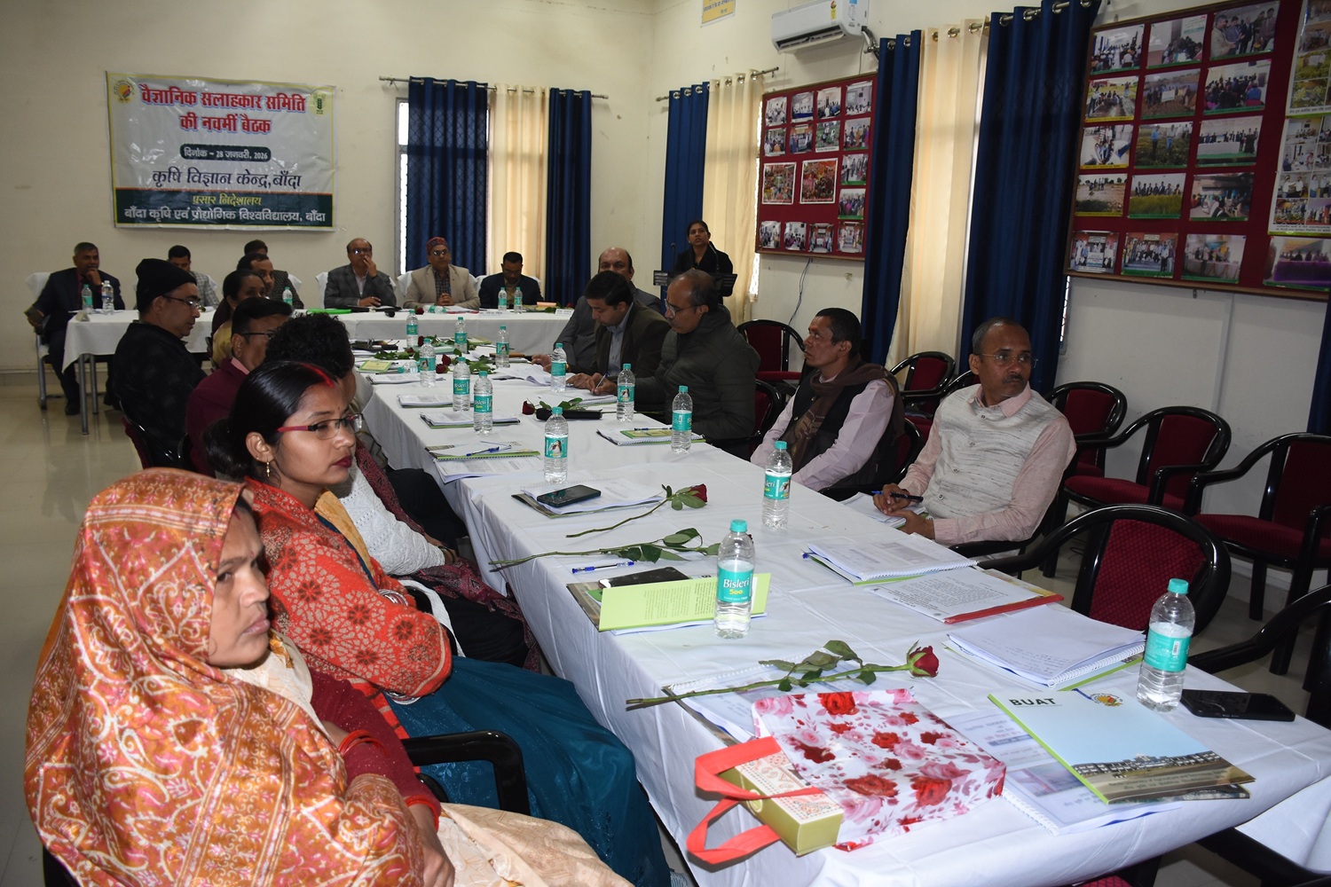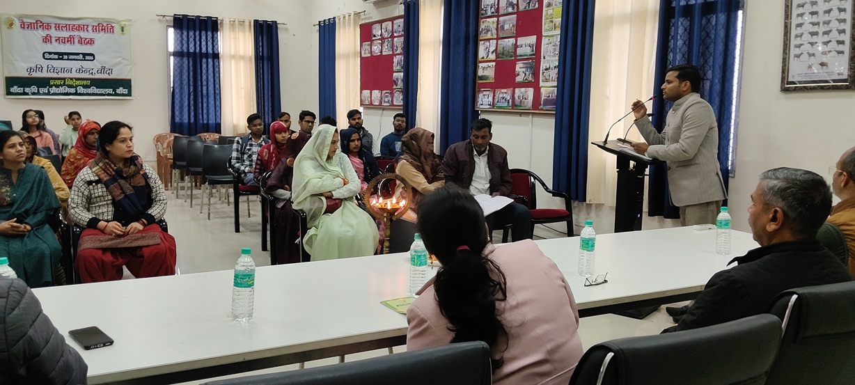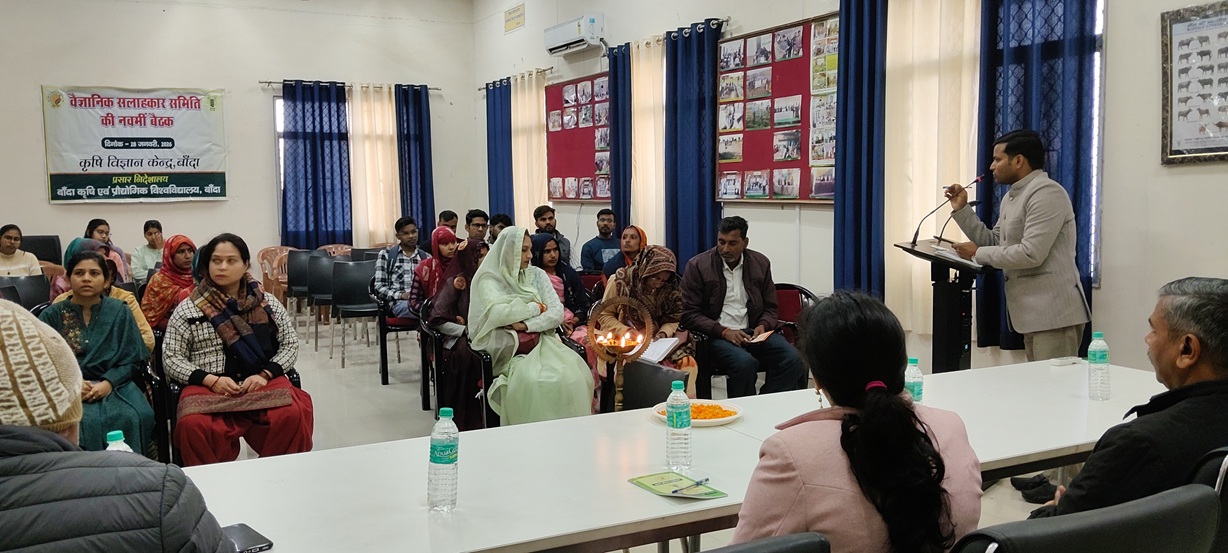 बांदा कृषि एवं प्रौद्योगिक विश्वविद्यालय अन्तर्गत संचालित कृषि विज्ञान केन्द्र, बाँदा द्वारा दिनांक 28.01.2026 को केन्द्र के प्रशिक्षण कक्ष में प्रातः 11ः00 बजे से ‘‘वैज्ञानिक सलाहकार समिति की नवम् बैठक’’ का आयोजन किया गया। बैठक में विगत वर्ष (जनवरी, 2025 से दिसम्बर 2025) की प्रगति आख्या पर विभिन्न वैज्ञानिक सलाहकार समिति के सदस्यों द्वारा समीक्षा तथा आगामी सत्र जनवरी, 2026 से दिसम्बर 2026 तक की वार्षिक कार्ययोजना पर विस्तृत चर्चा की गयी। इस कार्यक्रम की अध्यक्षता प्रो0 (डा0) एस0वी0एस राजू, माननीय कुलपति, बाँदा कृषि एवं प्रौद्योगिक विश्वविद्यालय, बाँदा द्वारा की गयी। सर्वप्रथम कार्यक्रम का शुभारम्भ दीप प्रज्जवलन कर किया गया। कार्यक्रम के अध्यक्ष प्रो0 (डा0) एस0वी0एस राजू, माननीय कुलपति जी ने कहा कि कृषि विज्ञान केन्द्र द्वारा आयोजित प्रत्येक गतिविधि एवं परियोजना के माध्यम से कृषकों पर पडने वाले प्रत्यक्ष एवं अप्रत्यक्ष प्रभाव का आंकलन अवश्य करें। केन्द्र के वैज्ञानिकों को कृषि विविधीकरण एवं सामेकित कृषि प्रणाली पर कार्य करने के निर्देश दिये। बाजार आधारित रणनीतियों को बेहतर करने के लिये कृषक उत्पादन संगठन की उपयोगिता पर चर्चा करें। विश्वविद्यालय के निदेशक प्रसार डा0 एन0के0 बाजपेयी जी ने कहा कि जनपद बांदा में धान की फसल कटाई उपरान्त उचित फसल अवशेष प्रबन्धन हेतु जीरो टिलेज मशीन व हैप्पीसीडर एवं पूसा डीकम्पोजर के प्रयोग हेतु कार्य करना चाहिये। बुन्देलखण्ड क्षेत्र में अलसी, मसूर एवं श्रीअन्न् फसलों के क्षेत्रफल को बढाने के लिये प्रयास किया जाना चाहिये साथ ही जनपद में गेंहू के बीज की उपलब्धता को बढाने के लिये सीड हब परियोजनार्न्गत बीज उत्पादन का कार्य करें। झांसी एवं चित्रकूट धाम मण्डल के संयुक्त कृषि निदेशक डा0 एल0बी0 यादव ने कहा कि जनपद में प्राकृतिक खेती एवं श्रीअन्न उत्पादन विषयों पर विशेष जोर दें साथ ही गुणवत्तायुक्त बीज एवं सब्जी पौध की उपलब्धता बढाने का प्रयास करें। बैठक में केन्द्र के अध्यक्ष डा0 श्याम सिंह ने केन्द्र की विगत वर्ष की प्रगति आख्या एवं आगामी वर्ष की कार्ययोजना व केन्द्र द्वारा चलाये जा रहे विभिन्न कार्यक्रमों की प्रगति आख्या प्रस्तुत की। तदोपरान्त डा0 चंचल सिंह, विषय वस्तु विशेषज्ञ (पौध सुरक्षा), डा0 प्रज्ञा ओझा, विषय वस्तु विशेषज्ञ (गृहविज्ञान) एवं डा0 दीक्षा पटेल विषय वस्तु विशेषज्ञ (कृषि प्रसार) ने अपने-अपने विषयों की प्रगति आख्या एवं कार्य योजना का प्रस्तुतीकरण किया। इस कार्यक्रम में डा0 नरेन्द्र सिंह सह निदेशक प्रसार ने अपने सुझावों में कहा कि कृषकों के मध्य के0वी0के0 की गतिविधियों को पंहुचाने के लिये सूचना संचार तकनीकी का अधिक से अधिक इस्तेमाल करे